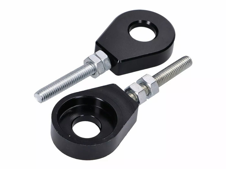 Anodized Aluminum Chain Tensions Set of 2 Pieces suitable for moped / Mokick rear Axle with 12mm diameter. The Set Comes With M6 Lock Nuts., Overall Length: 75mm, Hole Diameter: 12.5mm, Thread: M6, Thread Length: 40mm