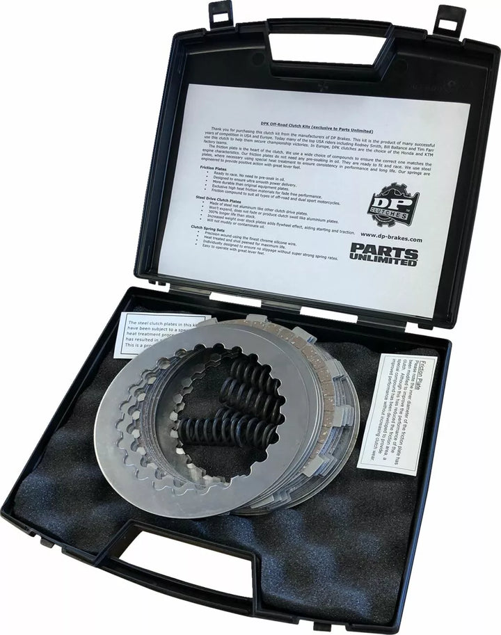 Designed to outperform any oem or aftermarket clutch, DPK kits included friction plates, steel drive plates and clutch springs, except When oem clutch includes reusable diaphragm spring, dpk clutch clutch kits in a foam-line tlast To installation, case can be used to store and transport parts, tools or other items after clutch is installed, come ready to race-no need to presoak plates in oil, designed to Ensure Ultrasmooth Power Delivery, Exclusive High-Heat Materials SUIT OFF-Road and Dual-Sport Bikes, More Durable Than Oem Plates, Steel Drive Plates, Steel Plates Won't Expand, Do Not Fade Or Promote Clutch Swell Like Stock Aluminum Plates, Long Lasting-Up to 300% More Life Life Thanks Plates for aiding starting and traction, will not muddy or contate oil, clutch springs, precision-wound using the finest chrome silicone wire, heat-Treated and shot-peened for maximum life, individual designed to ENSURE NO Slutage with Supe-Strong Spring Rates,