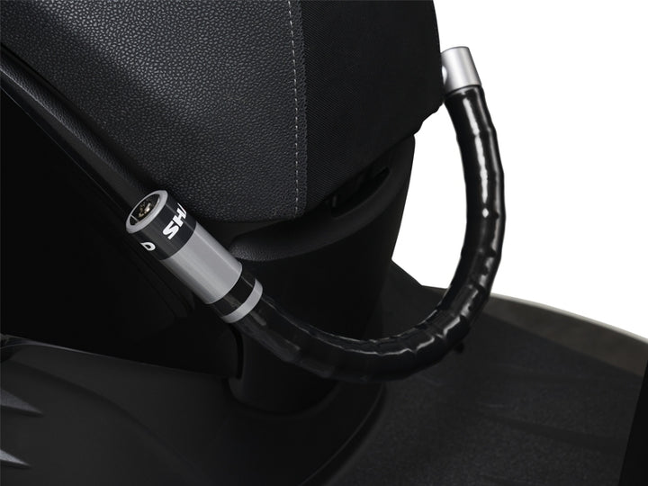 The Padlock Mounts under The Seat and Attaches to the Handlebar to Immobilize The Vehicle.