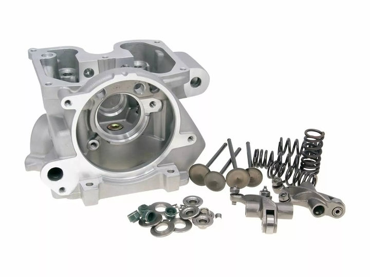 Naraku Racing 4-Valve cylinder Head with 62mm Combusttion Chamber to Satiate your Appetite for Power, Increased Flow, Reinforced Valve Springs and Larger Valves (21/33mm), SUITABLE FOR YAMAHA X-MAX, WR, WR, YZF-U 125 or fuel injection system must be re-tuned (z. B. with malossi force master), The cylinder head is suitable for following big bore cylinders: Naraku NK600.74, Polini 166.0101, Malossi M.3114852 и други цилиндъри 62mm, входящи клапани: 23 мм изпускателни клапани: 21 мм, новите модели имат обхват на сензора на ламбда директно на изхода (това трябва да бъде затворено при по -стари модели), обхват на доставка без валове за последователи