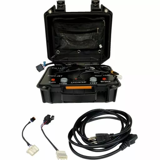 Custom Dynamics Product Test Test е необходимост във всеки дилър или магазин за мотоциклети; Елиминирайте работата на предположението в претенции за гаранция на клиентите и отстраняване на неизправности в продукта с този пълен тестов комплект, предварително кабелен и оборудван с щепсели за свързване на персонализирани Dynamics® най-популярни LED осветителни продукти; Той също така има лесни за използване терминални конектори за универсални проводни продукти, този компактен калъф се включи в електрическа рецидивка за мощност и има вградени моментни превключватели на спирачката и завой за тестване на всички приложими конектори на продуктовите функции, превключвател за захранване, спирачен и завой на сигнала, включва 2 проводни адаптери за разширени мощности, адаптер за захранване, включен в мощност, включен в мощностния превключвател за захранване, включен в мощностния превключвател за мощност, адаптер за захранване, включен в мощностния превключвател за мощност, адаптер за захранване, включен