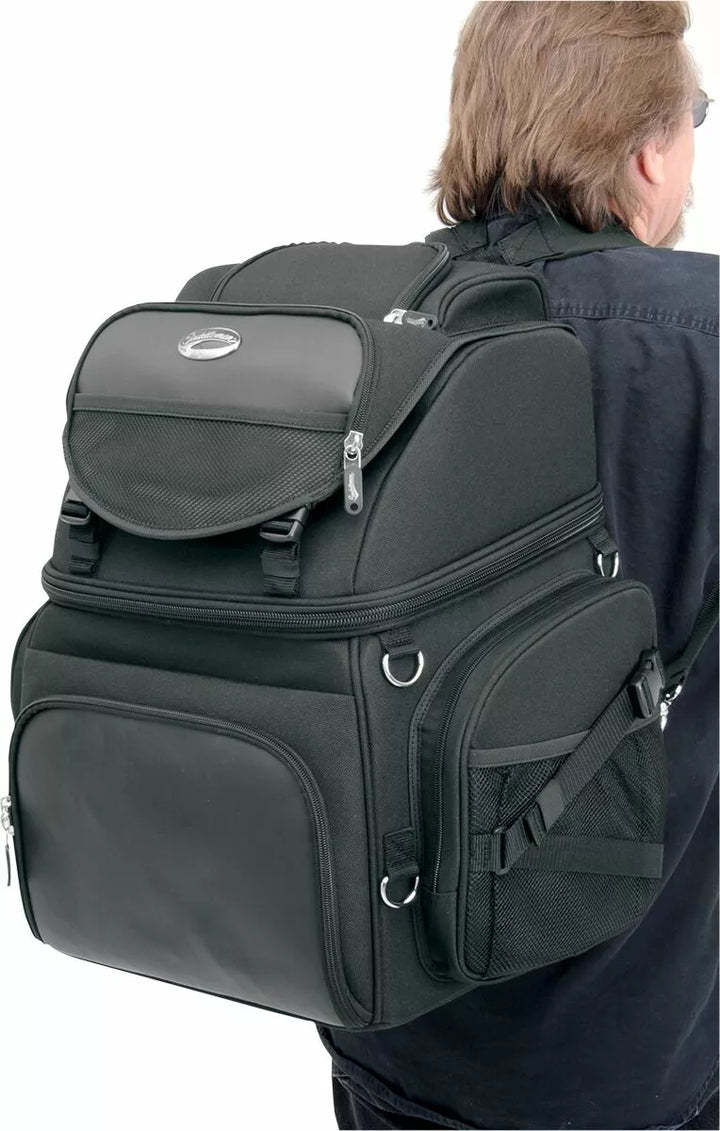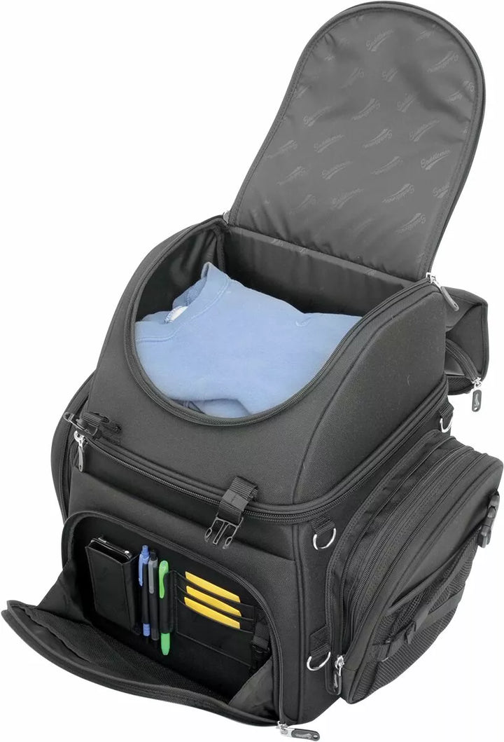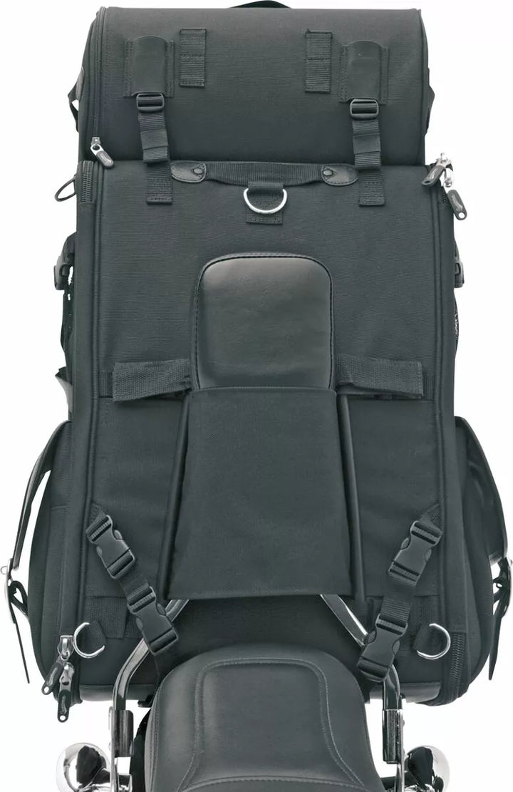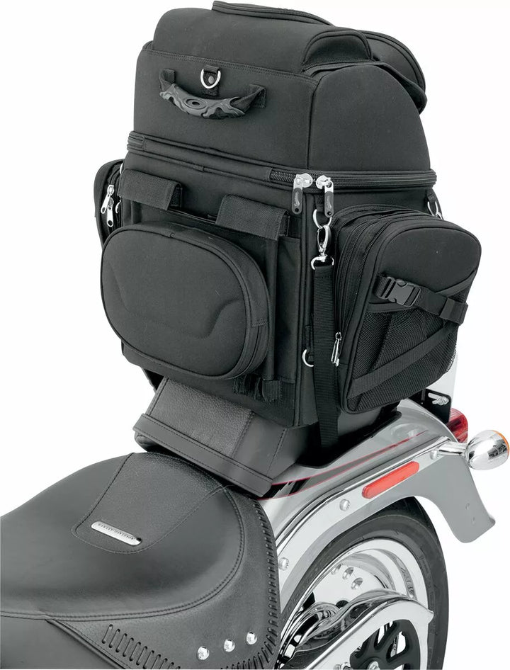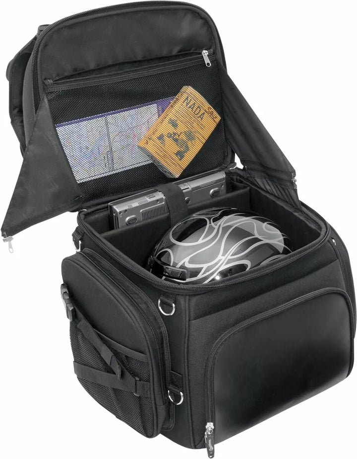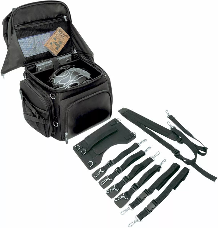 Две системи за монтаж включват: „Верса“ на седалки и сбруя на седалката и регулируема система за каишка с регулируема бар, която лесно закрепва чантата към седалката на вашия мотоциклет, багажника за багаж или сисния бар, подложка за облегалка може да се регулира с дезакул За добавен капацитет, пет вътрешни и два външни мрежести джоба, горният външен капак може да се регулира, за да носи яке, мини палци, с допълнителни ключове, помага да се защитят вещите ви в чанта