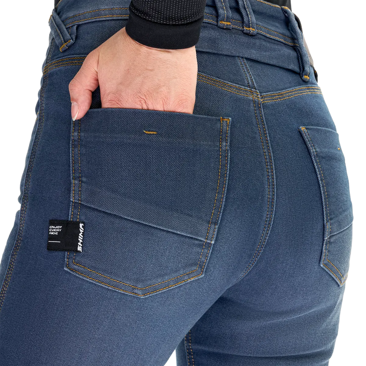 Търсите ли чифт мотоциклетни дънки, които се чувстват като любимите ви дънки, но защита като напълно оборудвана дреха на MC? Дама Шима Ридж Дали най -безопасните женски дънки в гамата на Шима, с AAA сертифициране Според най -високия стандарт за защита.
