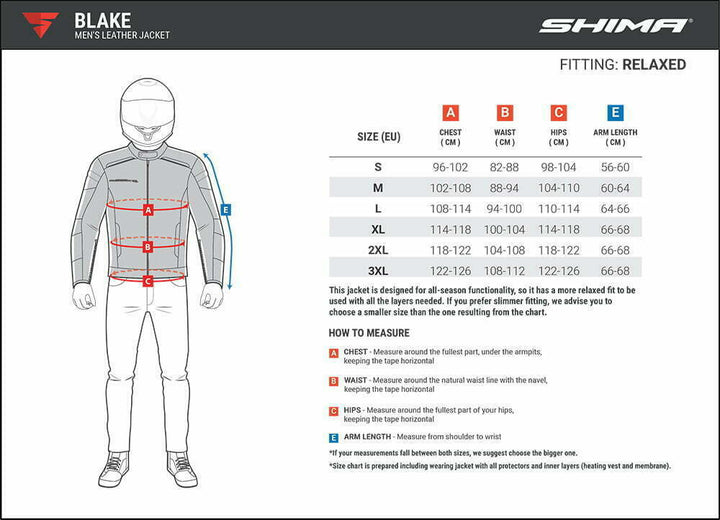 Той ще бъде особено оценен от любителя на винтидж стил, който търси универсален продукт, който ще ги придружава както, докато шофират, така и след слизане от мотора. В допълнение към веригата за заглавие на H3 е незадължителна функция за контрол на въздушния поток - мощен панел за охлаждане, който може да се отвори по цялата дължина на якето. Якето Blake е оборудвано със сертифицирана защита на лакътя и гърба, включително защитата на Armor Plus на Shima с ефект на паметта върху гърба, което гарантира най -високото качество на безопасността, съчетано с изключително чувство за комфорт по време на ездата. Якето е оборудвано с умен скрит сух джоб в подплатата, а къс цип ви позволява да го прикрепите с избрани панталони на Shima. Всеки модел се предлага с ключов пръстен в кожа, който перфектно се вписва в якето ви.