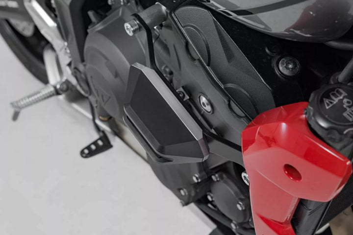 Frame Crash Pads Provide Additional Protection in the Event of A Fall, The Shape, Surface and Materials of the Pads Provide Excellent Sliding Properties to Reduce Damage to the Motorcycle, The Robust Aluminum Mounting Bracket Is Easy to Install, and the Abrasion Prazion Prazion Protection of the Frame, Engine and Fairing, Well-Shaped, Exchangeable (IF Needed) Slider Pad Made of Abrasion-Resistant Polyamide, Large Contact Surface for Best Possible Force Distribution, Optimized Surface of Good Плъзгащи се свойства, алуминиева сплав, лесен монтаж и здрава закрепване на рамката благодарение на специфични за мотора елементи за добавки, включени в доставката, 2 x подложки за катастрофа, инструкции за монтаж, монтажен материал
