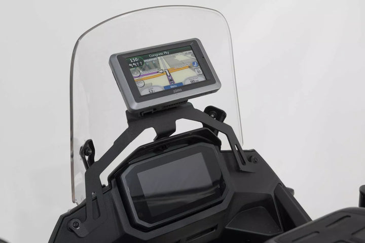 In Order to Achieve Optimal Positioning, A Powder-Coated Steel Plate Ensures The Stable Attachment of the GPS Mount on Original Attachment Points in the Cockpit, Clever Positioning, Vibration Dampen and Easily Removable: The Bike-Specific GPS MOFE Combines All Of These POINTS IN THE COCKPIT, GPS MOUNT MADE OF BLACK, POWDER-COATED STEEL WITH Quick-Lock Mechanism Made of Glass Fiber Reinforced Plastic, Made to Fit Each Bike Model for Optimal Позициониране, сменяемо, основно и шоково-боксово задържане за обичайните GPS модели и калъфи за устройства на Navi Case Pro или твърди канали от SW-мотив, включени в доставката, 1 x GPS монтаж за пилотска кабина, инструкции за монтаж, монтажен материал