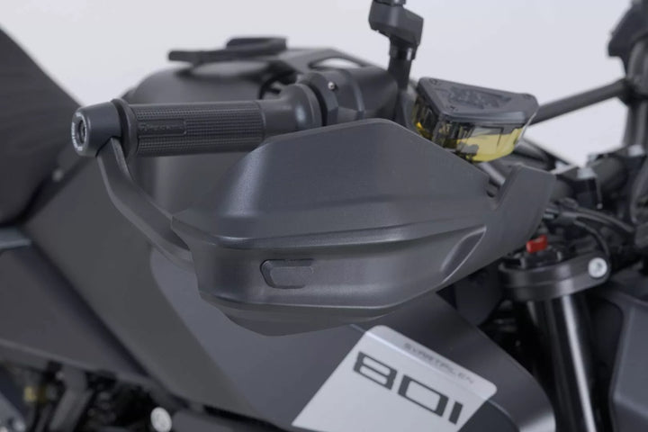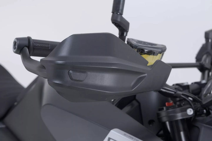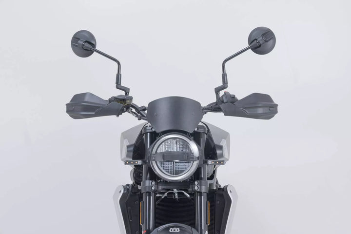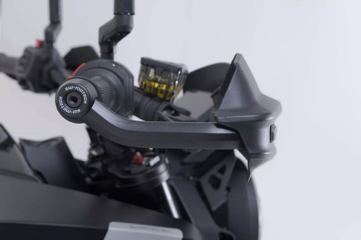 Прост двуточков монтаж без специални инструменти, специфична за мотора алуминиева скоба с висококачествено прахово покритие, надеждна защита на фитингите на кормилото в случай на падания, приключенски черупки на ръчна охрана, направени от удар от Weat Weat Weat Вместо това, аеродинамичен дизайн, Matt Black Finis Приключенски материали, подробности, материали: пластмаса / алуминий, цвят: черен / черен